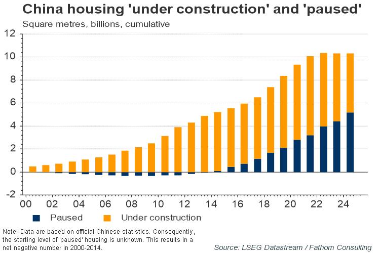 At the current rate it will take about seven years to sell the total housing stock, however official numbers do not capture the true picture. For while the total square meterage under construction has been shrinking, ‘paused’ housing, which is not reported in the official statistics, has been increasing steadily. Some of this hidden stock has likely been demolished before completion, however it still means that the true depth of China’s housing market woes is substantially more than at first glance. Couple this with China’s demographic decline, and therefore an increase in vacant homes in the future, and it looks like China’s housing market problems are here to stay.