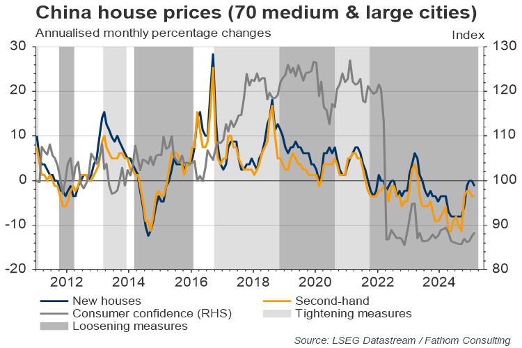 However, with investment having far outpaced demand, this has led to a buildup of massive imbalances in the housing market and Chinese authorities find themselves in a difficult juggling act of trying to reduce imbalances while avoiding a complete real estate collapse. Xi’s ‘three red lines’ in 2021 showed just how shaky the situation was and started the current housing malaise, which saw real estate giants such as Evergrande default on their commitments, consumer confidence tank, and Chinese house prices fall throughout much of 2023 and 2024, in spite of government efforts to support them through the use of measures such as easing home-buying restrictions.