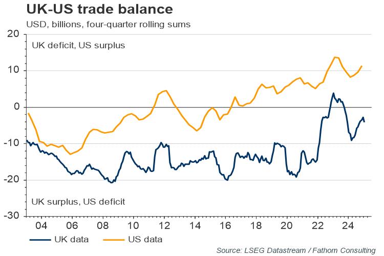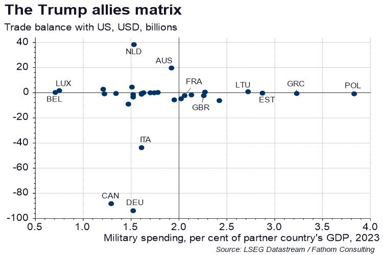 The UK presents itself as another interesting case. Thanks to its recent increase in military spending, it now spends more than 2% on defence (although that is someway short of the 5% number currently being bandied around). The UK also stands out as shipping roughly the same amount of goods to the US as it buys from it. Interestingly, on this point, the answer of whether the UK has a surplus or deficit with the US depends on which country’s data you look at — American data show that the US is the net exporter while British data suggest that the UK is the net exporter. Either way, the balance is close to zero.