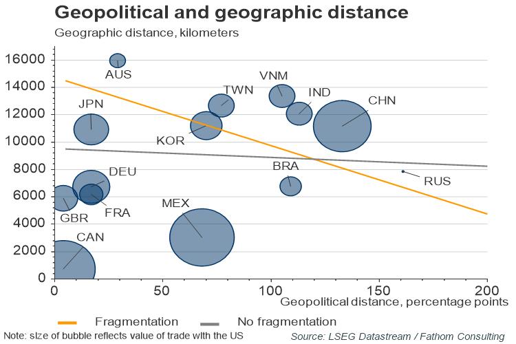 We can see what that might look like in the chart below. The x-axis measures geopolitical distance by observing whether countries have mirrored US foreign policy decisions during recent geopolitical disputes. (A score of 0 implies that a country supported the US in all disputes examined, while a value of 200 would indicate that a country has opposed US decisions in all instances). The two bold lines in the chart below show combinations of points where the US would be indifferent in its choice of trading partner, controlling for the sizes of their economies. The grey line shows a ‘low-tension state’ for the world (where the predominant factor that matters is geographic distance) while the orange line shows an hypothesized ‘state’, where geopolitical distance would matter too. Over time, and as global tensions rise, we might have expected the US to move towards the blue line.
