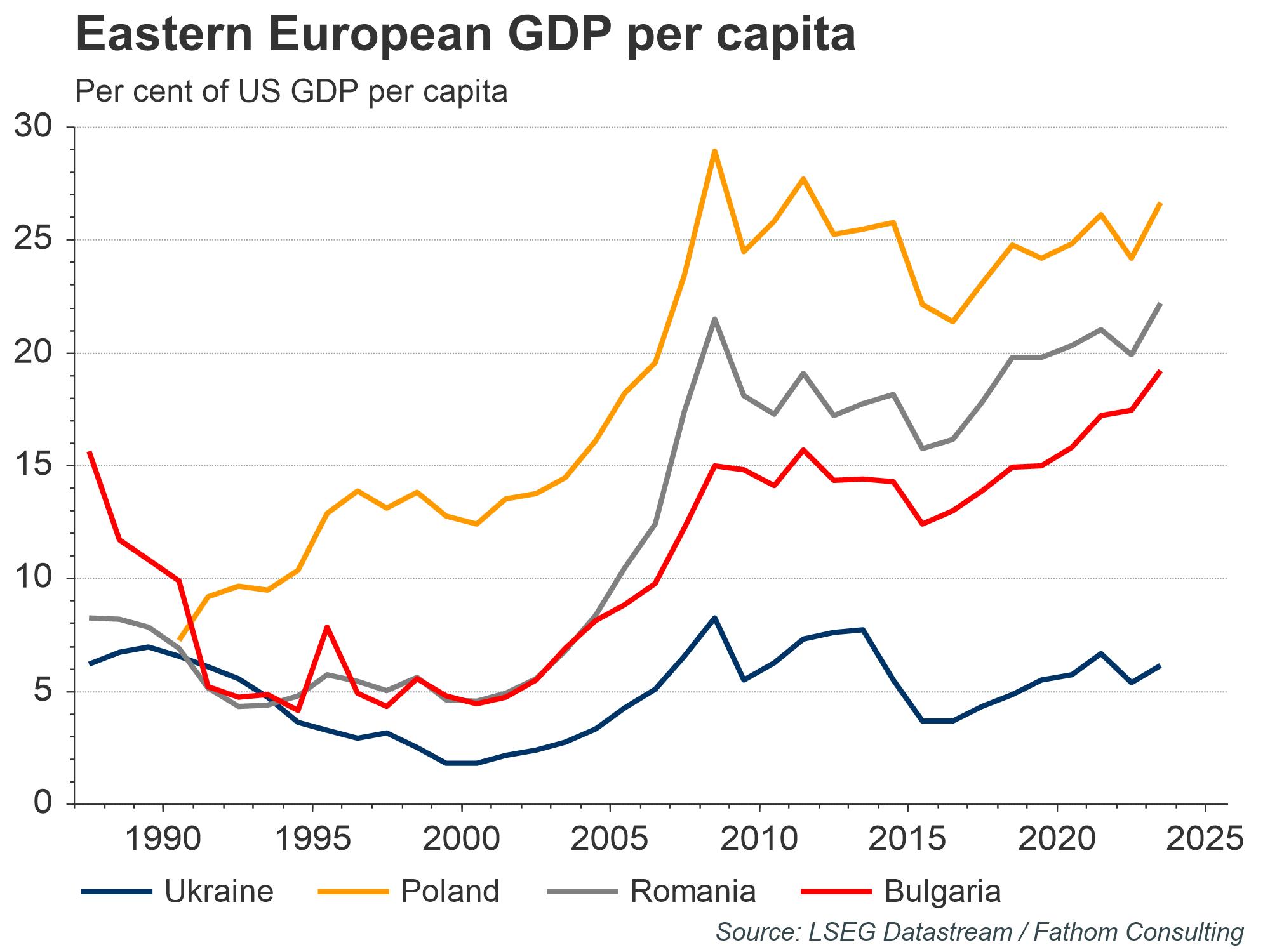 Ukraine would not only seek to reconstruct, but rather reinvent its economic model, which had previously shown substandard GDP per capita growth. Even when accounting for Russian aggression prior to 2022, Ukraine’s economy appears to have been fairly stagnant, showing little sign of converging towards US GDP per capita (as its neighbours have done, to a certain extent, see chart). Moreover, Russian forces have now blocked traditional sea-based export routes to Middle Eastern and Asian Markets. Russia has also bombarded Ukraine’s energy grid and key industrial zones, further disabling Ukraine’s economic growth model.