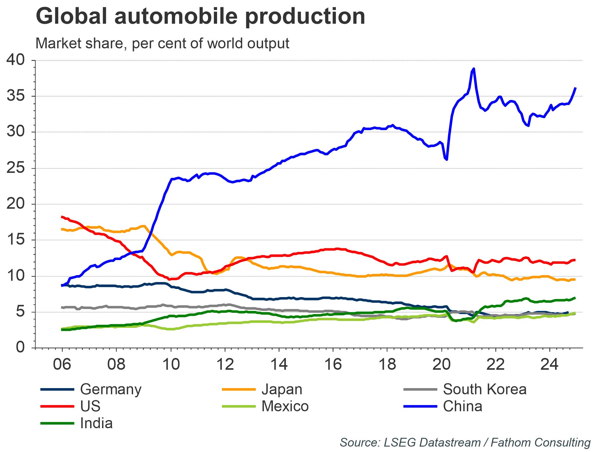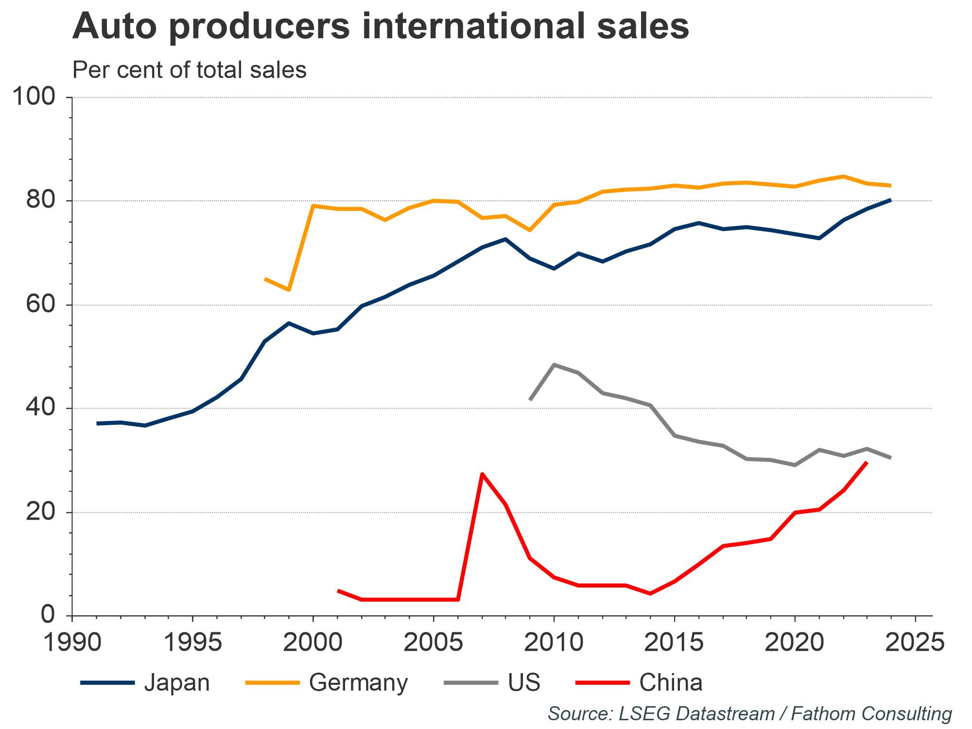 One thing to note here is the distinction between the output of the car companies themselves and how that is recorded in national accounts data. GDP (gross domestic product) is by definition a domestic concept and so is designed to capture domestic production (including that which is later exported), but not overseas production. For example, the output of a Japanese carmaker’s European factory would be counted in Europe’s GDP rather than Japan’s (although it would however be captured in Japan’s gross national product — GNP). It turns out that this distinction is particularly important for the major German and Japanese carmakers, for whom ‘international sales’ — defined as ‘sales generated from operations in foreign countries’, excluding exports — are around 80% of their total revenue.[1] (For US and Chinese autos firms, the share of international sales is less than half this number, although the proportion is rising rapidly for Chinese companies.) Competition from China will therefore also have consequences for the countries to which autos production is outsourced. If a large portion of employment in those countries is linked to producing German- or Japanese-designed cars, then GDP and jobs could in turn suffer as Chinese car production increasingly dominates global export markets — especially as, at least for now, the majority of China’s production is domestic.