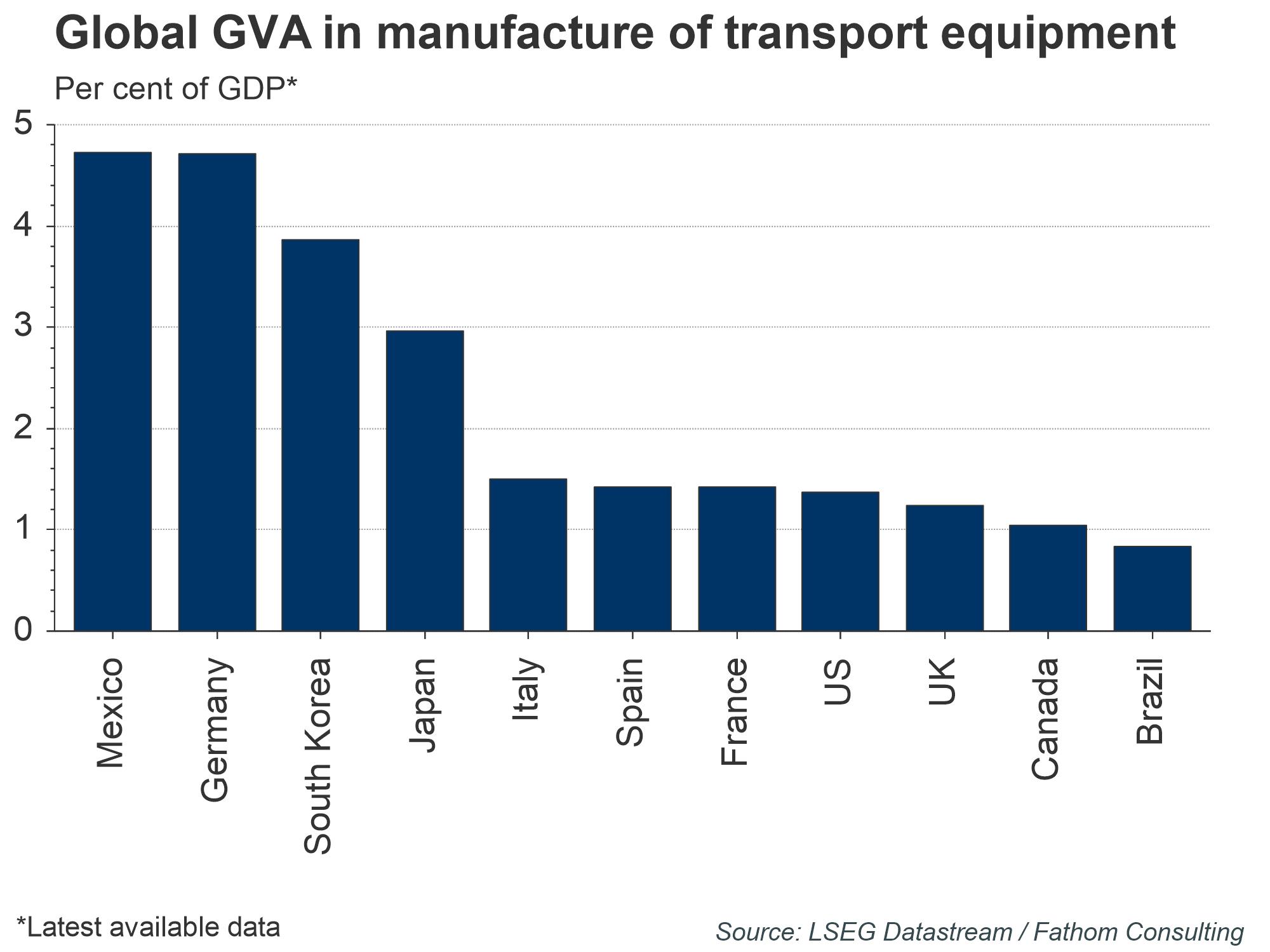 Of course, China’s new-found export prowess will affect the industry’s incumbent producers. The chart below shows the importance of the transport equipment sector to countries’ economies. Four countries stand out as particularly vulnerable to Chinese competition — Mexico, Germany, Japan and South Korea — with the manufacture of transport equipment representing 3% (or more) of their respective GDPs. For most other major producers, the total value of their domestic production is in the 1–2% range.