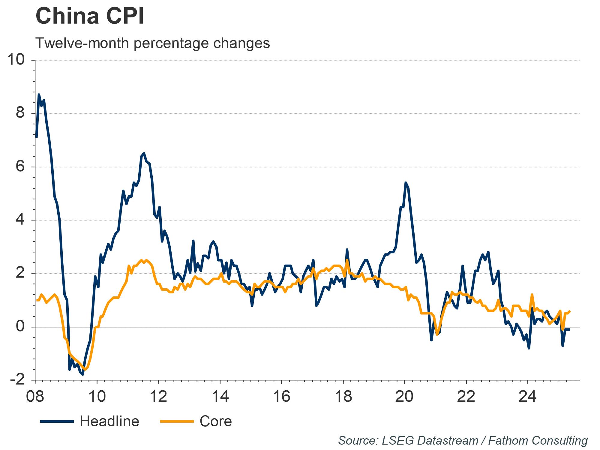 Headline inflation in China came in at -0.1% in April (in line with both consensus and the previous month’s print) while core inflation was also unchanged at 0.5%. The weakness in the inflationary outturns reflects one of the major challenges for China’s policymakers — stimulating weak domestic demand. Fathom has consistently outlined how this has been a feature of China’s economy for more than a decade, with the household saving rate much higher in the PRC than in most other countries. This stands in stark contrast to the external side of China’s economy where the goods trade surplus continues to balloon and now stands at around $1 trillion per year. However, question marks remain about the sustainability of this export-led growth strategy, given the new US administration’s desire to erect trade barriers between the two countries (in response to what it perceives to be unfair practices deployed by the PRC). At the time of writing a deal between the world’s two largest economies appears to have been reached, although the full details are not yet known. Those details may have a significant impact on the outlook for both economies over the coming years, including their respective saving and inflation rates.