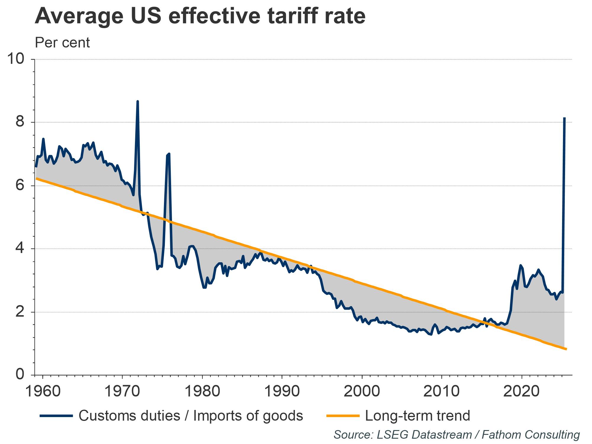 Tariffs now define Washington’s trade stance. The effective rate on US imports was surging well above its long-term trend, even before the Liberation Day announcement that, according to Fathom, catapulted it to around 33%. Like any tax, tariffs bolster federal revenue and lift consumer prices, prompting less spending and more savings, something that could marginally raise the national saving rate.