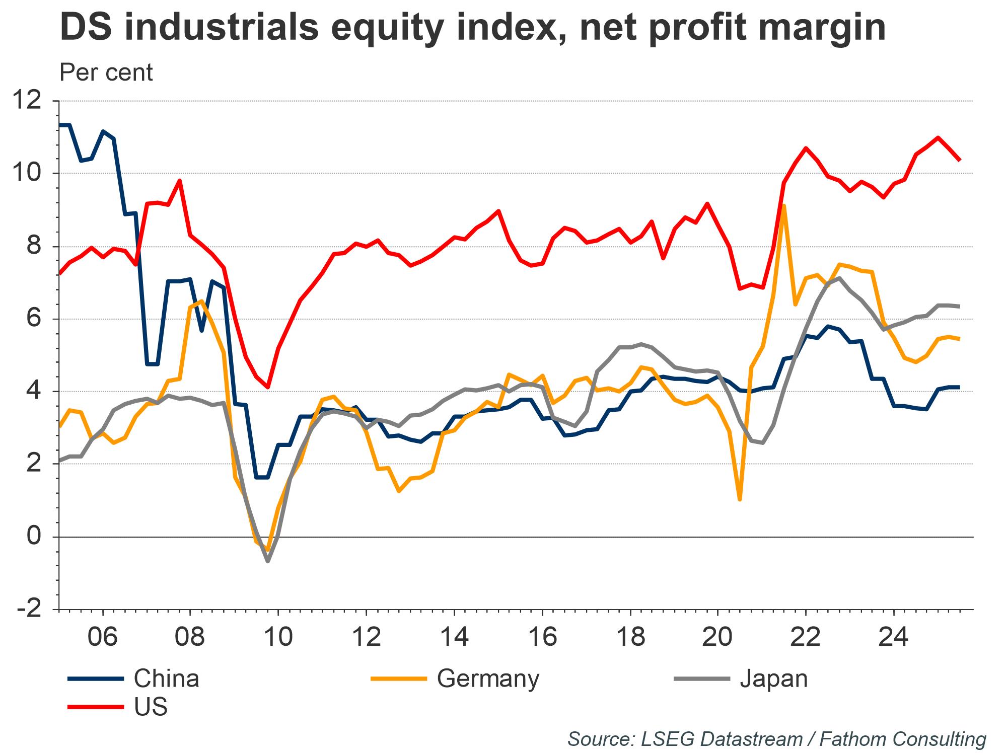 China stands on the other side of the ledger. Together with Hong Kong, it commands the world’s largest positive net external asset position, built on persistent trade surpluses. US tariffs aim to erode that surplus, yet Beijing’s options are limited. Absorbing duties is untenable — average profit margins in tariff‑exposed manufacturing hover at near to 4%, and well below those of other countries. Moreover, permanent subsidies would strain the public purse. A more likely mix is targeted support and gradual renminbi depreciation. Absent of a decisive pivot to household consumption, China will continue exporting both savings and mild deflation to the rest of the world.