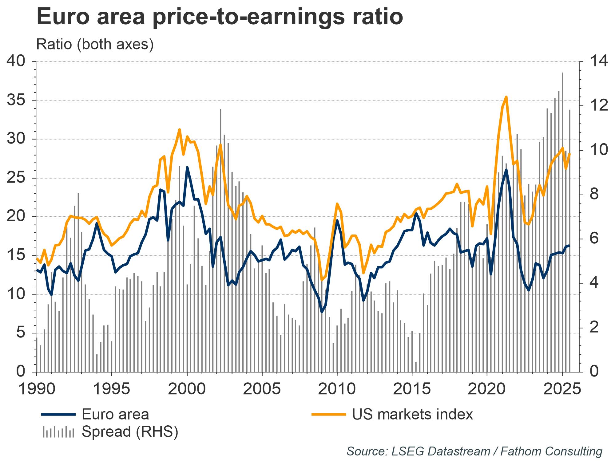 This, in turn, is already shaping equity markets: the forward P/E gap between US and euro‑area indices has narrowed from about 14 points in 2022 to 10, the first meaningful compression in four years. Valuation convergence reflects more than mathematics. Higher real rates push up the US equity‑risk premium as earnings momentum cools, while renewed European fiscal support brightens the outlook for cyclicals — especially defence. Since the 2024 US election, European defence shares have rerated sharply; multi-year procurement plans and political sponsorship have lowered the discount rate on their cash flows.