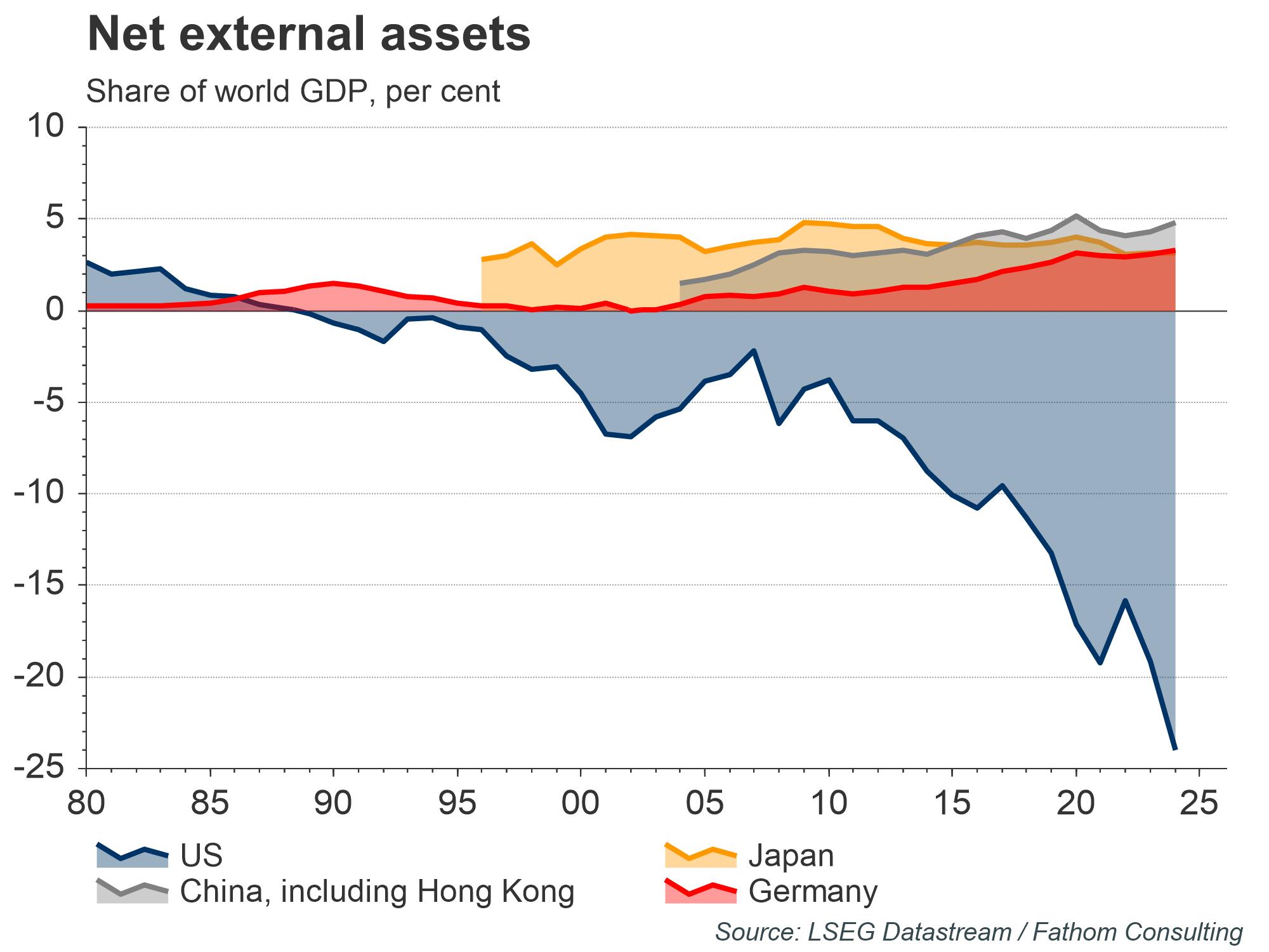 They do not, however, change the core arithmetic: domestic demand still exceeds domestic output, so the US continues to fund its spending with foreign capital. The net external liability position has drifted towards one quarter of annual global GDP, financed by the same overseas investors that the tariffs are meant to deter.