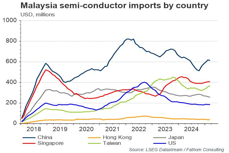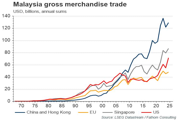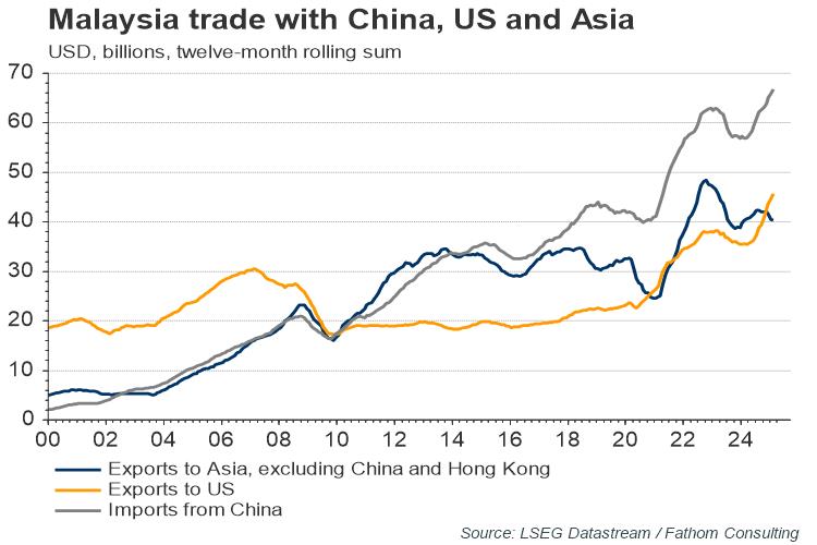 Malaysia’s trading relationship with the US is also important to its economy; last year, Malaysian exports to the US overtook its exports to the rest of Asia (excluding China and Hong Kong). As US tariffs on Chinese goods currently stand at 145%, Malaysia has two dilemmas to navigate. First, there is the threat of increased tariffs levied against Malaysia if its practice of re-exporting Chinese goods to the US accelerates. Second, demand for southeast Asian goods is at risk of diminishing if China looks to flood ASEAN markets with cheap substitutes. This scenario, when coupled with the blow to global demand from President Trump’s ‘Liberation Day’ tariffs, could lead to deflation.