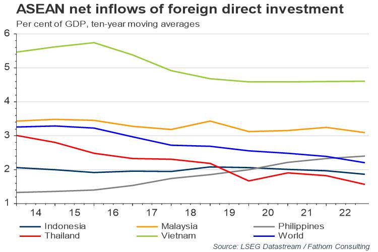 However, Malaysia is more than just a re-exporting hub for China — it also enjoys relatively high levels of foreign direct investment. According to World Bank data, it has attracted FDI of between 2-4% of GDP on average per year, consistently above the global mean. With Singapore — South-East Asia’s financial hub — on its doorstep, and ever-growing manufacturing prowess, Malaysia has been a popular candidate for Western multi-nationals trying to decouple their supply chains by implementing ‘China plus one’ strategies.