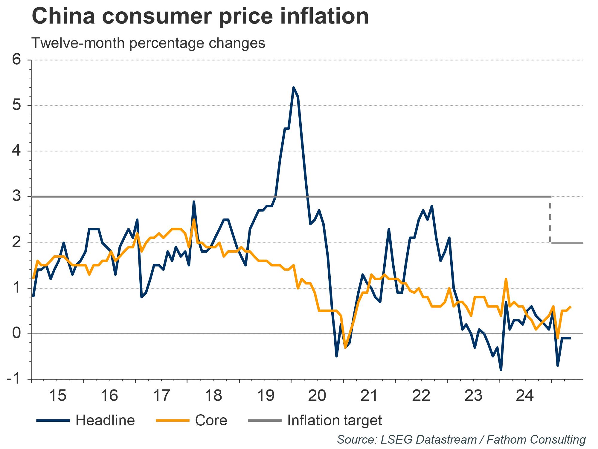 Chinese annual consumer price growth was negative for the fourth month in a row, declining by 0.1% in May. Core inflation, which excludes food and energy items, was in positive territory, with prices 0.6% higher than in May of last year. Excluding periodic spikes driven by food prices, Chinese headline price growth rarely reached the old inflation target of 3% and seems set to continue to undershoot the new target of 2% adopted at the 2025 National People’s Congress.