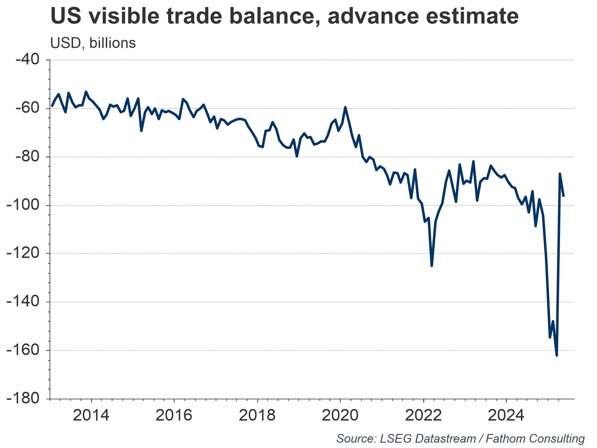 The US trade deficit in goods almost halved to $87.6 bn in April, as imports slumped 19.8% on the back of increased tariffs. Imports had previously increased rapidly since the end of last year due to front-loading. April marked peak trade uncertainty, with the average US effective tariff rate at one point rising by more than thirty percentage points, and the levy on China at one point up 145 percentage points. Given the tariff shock, imports fell sharply from $344 billion to $276 billion. Exports rose by 3.4%. Trade uncertainty remains elevated: at the time of writing, the effective US tariff rate is around 13 percentage points higher than at the start of the year. Some in the US will no doubt cheer the rapid shrinking of the trade deficit. However, such a large monthly drop in imports does not come for free. If the import slump is sustained over time, US businesses and households may eventually face less choice or higher prices, or both. Admittedly, inventories data suggest that firms still have stockpiles to run through after front-running the tariff increase. That may be a temporary reprieve. The bigger picture, as we noted in a previous Chart of the Week, is that the US has played the role of consumer of last resort for a long time, with a large negative position on net external assets the result. It may have a reason to be upset with the status quo. A more sustainable global rebalancing would also involve increased demand from those creditor economies. For the moment, that does not appear to be forthcoming.