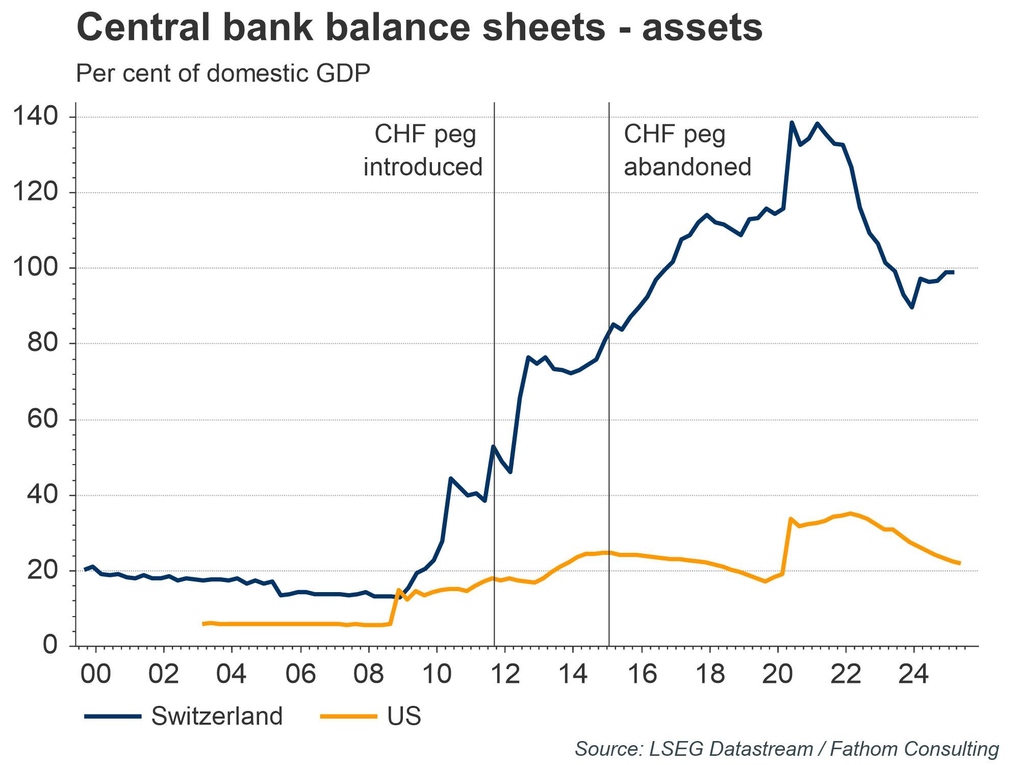 An alternative to coordinated action would be for the US to attempt to unilaterally weaken the dollar. One precedent for this was when the Swiss National Bank (SNB) maintained a peg with the euro for several years during the European debt crisis, promising to buy unlimited euros to help maintain it. The assets on its balance sheet rose by 30 percentage points of GDP during this period, and eventually it was forced to give up. Nonetheless, even after dropping the official peg, the SNB’s balance sheet continued to soar as it intervened repeatedly to weaken the franc. This rise during the official peg period rather crudely implies around USD10 trillion in Fed purchases. This would be a political headache at home and abroad, as the Federal Reserve would be acquiring a large amount of the world’s outstanding sovereign debt.