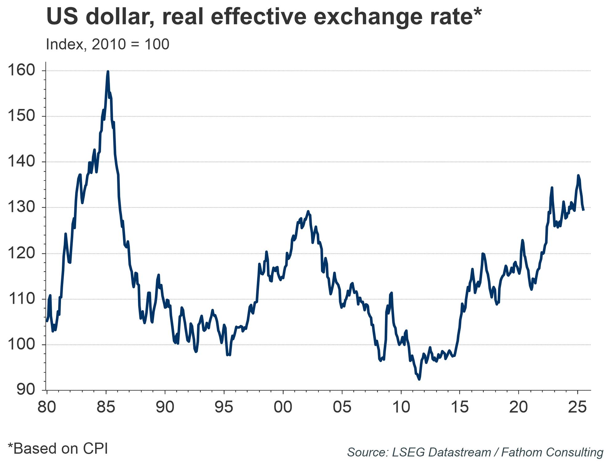 With both multilateral and unilateral options facing challenges, the upshot is that there is unlikely to be a large (20%) decline in the dollar real effective exchange rate. At the same time, the US budget deficit is expected to remain large for the next few years. That means that we can continue to expect trade imbalances, with the US trade position remaining in the red. One path out that we considered in Fathom’s recent Global Outlook was that large creditor economies, such as China and Germany, could add meaningfully to global demand. That still appears to be forthcoming in Germany. But the recently agreed US-China deal makes no mention of structurally weak Chinese demand. Whether it will form part of a longer-term strategic agreement, as US Treasury Secretary, Scott Bessent, has suggested, remains to be seen.