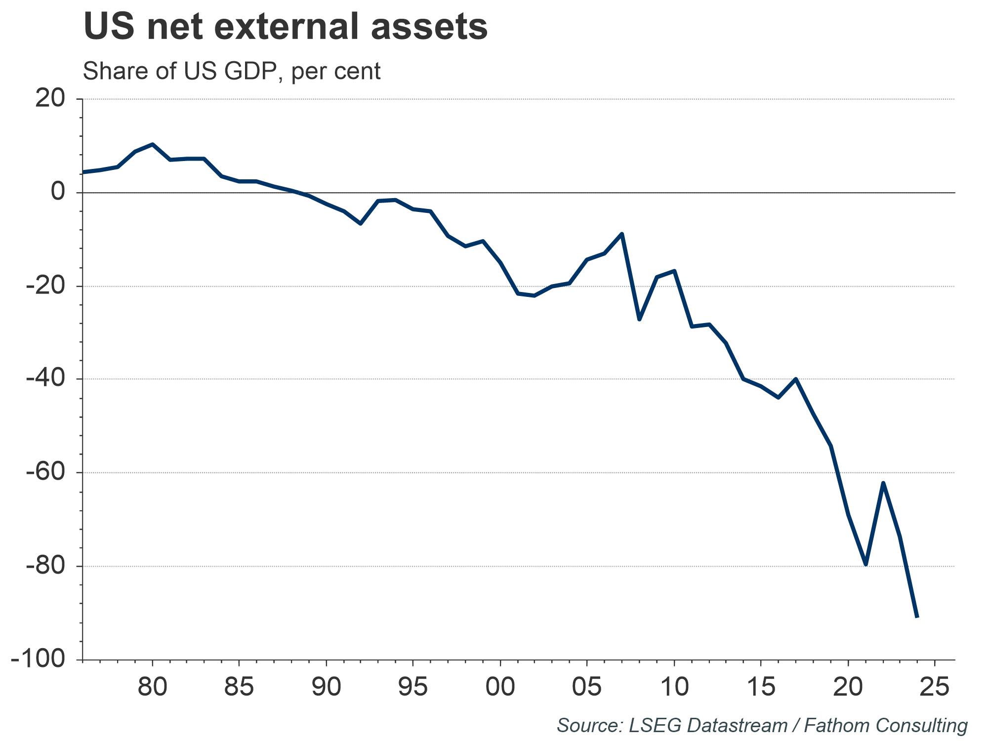 A strong dollar has no doubt reduced the competitiveness of US manufacturing and contributed to chronic trade deficits. The sum of persistent current account deficits are part of the reason for a large and rising negative net external asset position. Although it is also worth noting that a lot of the most recent move reflects valuation effects, as the value of foreign holdings of US equities has soared.