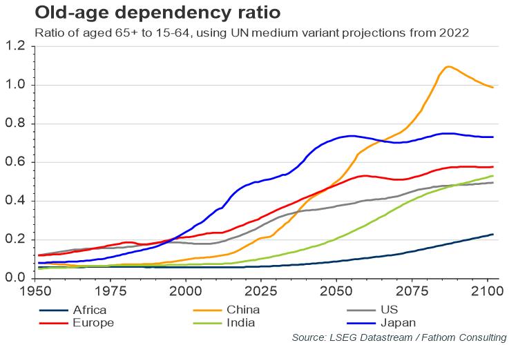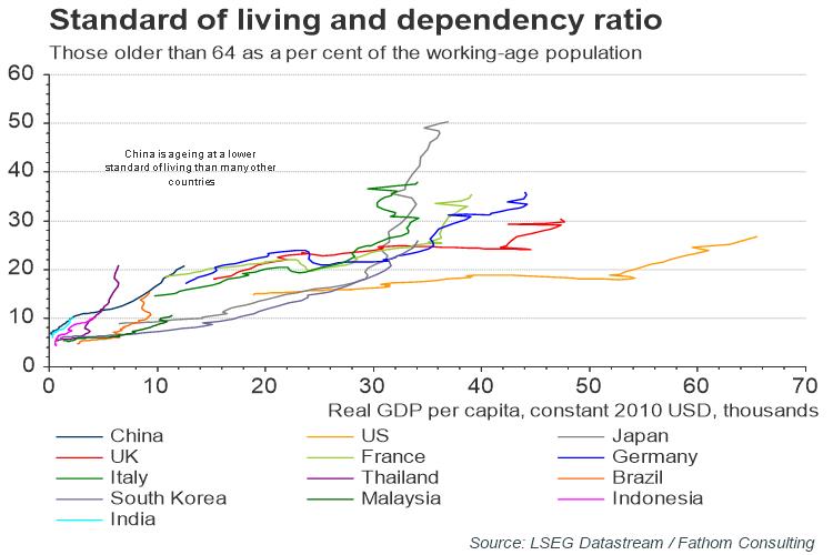 A rapidly ageing population in China and across advanced economies is highlighted by the expected increase in old-age dependency ratios. The latter are forecast to increase quite markedly in Europe and the US, but to a lesser extent than in China. China is ageing at much lower levels of income than has historically been the case.