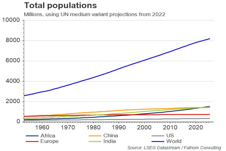 The global population will continue to soar and peak at around 10.5 billion later this century according to the UN’s latest forecast. This suggests that we will see dramatic changes in the composition of the global population. China is expected to lose its crown as the world’s most populous country to India, with the Middle Kingdom’s population forecast to almost halve by 2100. The population of Europe is also expected to fall from almost 750 million to under 600 million by 2100,[1] whereas the population of the US is expected to continue to rise from less than 340 million to almost 400 million. The rapid growth in the global population will be primarily driven by Africa, whose population is forecast to almost triple by 2100.