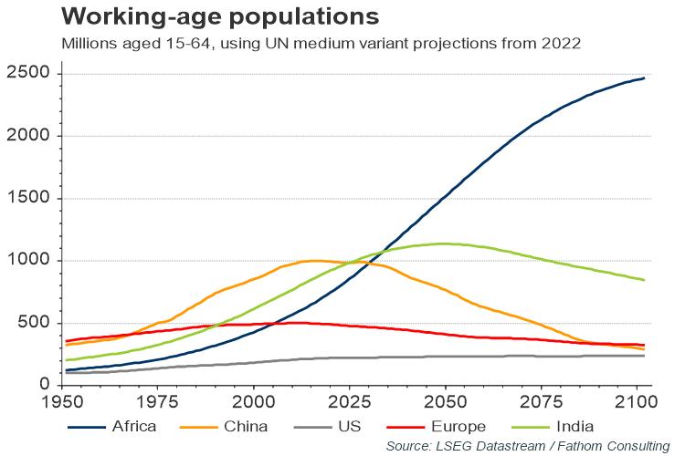 The previous rapid decline in its birth rate, means that China’s working-age population has already begun to fall, and this process will accelerate sharply through the 2030s. The working-age population of Europe will continue to decline, while that of the US will be largely unchanged. The ultimate impact on trend growth will depend on whether countries can find offsetting increases in productivity growth. The growth in the global working-age population will largely come from Africa, where it is estimated to increase from around 800 million to 2.5 billion by 2100.